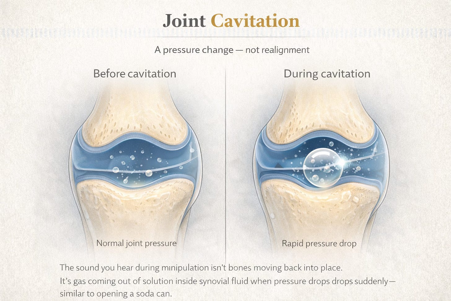 The sound comes from joint cavitation — a rapid pressure change inside the joint. Synovial fluid contains dissolved gases, primarily nitrogen. When a joint is suddenly distracted, pressure drops quickly, allowing a gas cavity to form. That event produces the audible pop.