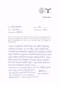 “Saya mengalami sakit leher dan sakit belakang selama 10 tahun. On and off. Saya dapat tahu tentang Pusat Rawatan Yap Chan Kor daripada saudara saya. Setelah menjalani rawatan selama 7 hari disini saya dapati sakit berkurangan sebanyak 90%. Terima kasih kepada fisioterapis Cik Najihah kerana memberi rawatan terbaik kepada saya. Saya juga telah pun recommend kepada sepupu saya.