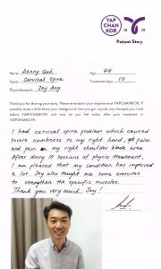 Danny suffered from a cervical slipped disc which caused discomfort, pain and numbness down his right arm to his hand. This sensation is not only very uncomfortable and painful, it also causes a loss of function. Danny had trouble using his right arm for daily activities. He came to see us and was treated by our physiotherapist Joy. Glad to hear that he’s improved tremendously. Thank you for sharing your story!