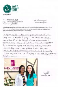 “I injured my elbow from playing volleyball and had pain every time I extended it fully. I had visited other physio centres but did not like having to sign up for long drawn and expensive courses. Then, I found YCK online which is affordable for a student like myself and has very good physiotherapists who will fully explain your problems and pain. Plus what exactly the different treatment methods do. I will be returning to treat my ankle here too. I highly recommend physiotherapists Sangitha and Anitha.” – KK