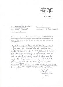 “My mother suffered frozen shoulder. Her first injury occurred 4 years back and recurred after she abandoned the exercise regime prescribed by previous physiotherapist. We encountered YCK after browsing website. My mother started with severe pain and her ability for mobility reduced to almost more than 50%. After 14 treatments, I can acknowledge that she has better mobility and close to almost no pain. She follows the exercises prescribed closely. And we are thankful to YCK physiotherapist Ema, for her patience and compassion while treating my mother.” – Aliza, daughter of Puan Rahmah