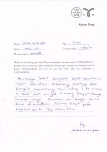 “Mulanya, lutut bengkak. Sakit bertahun-tahun menahan. Sekarang sakitnya dah banyak berkurang. Dari tahap 7 ke tahap 2. Kaki dah banyak kurang bengkaknya. Terasa ringan. Senaman pun bagus untuk terus diamalkan. Terima kasih pada Najihah serta Yap Chan Kor.” – Salbia